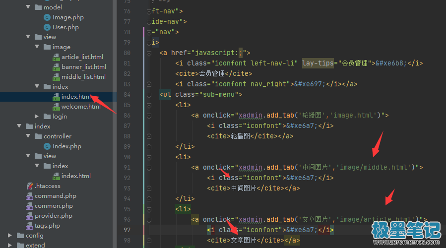 修改后台index.html页面,将轮播图下方两个改成上面创建的两个方法,image/加方法名,这边需要路由到控制器里的方法操作,不加操作默认是到index方法。